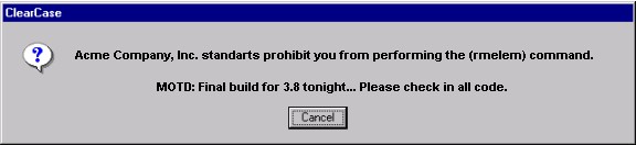 The MOTD (Message Of The Day) can be blank or populated and provides a method for the policy maker to communicate important messages to their ClearCase users. Any text placed in the field is displayed as a tail on many question or advise dialog boxes. The message is displayed for both ClearCase non-web users and web users. For example: